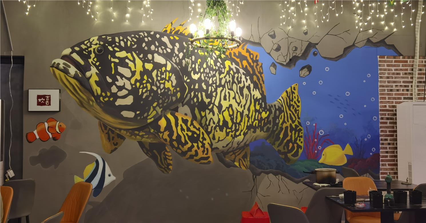 3D手绘鱼,烧烤店墙绘,店面涂鸦,立体画彩绘